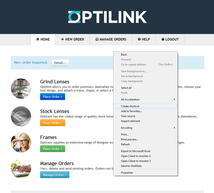 - In the main screen of Optilink Online, right click on the background and select Create Shortcut from the pop up menu.