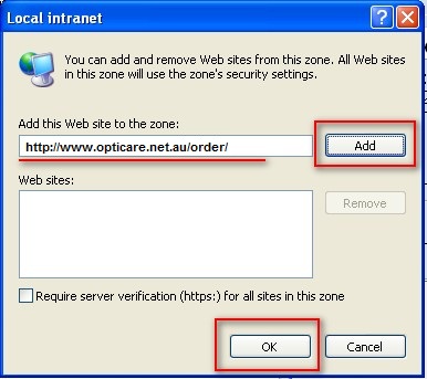 - Type http://www.opticare.net.au/order/ in Add this Web site to the zone: and click Add button. Make sure Require server verification (https:) for all sites in this zone is unticked.
